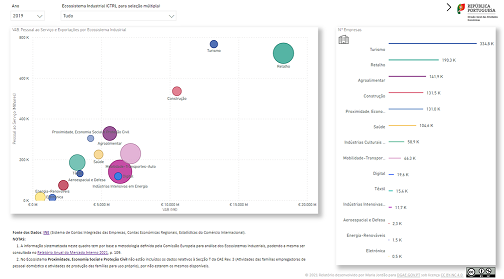 Tendo em conta que muitas das discussões e negociações em diversas formações de peritos da Comissão Europeia e níveis do Conselho da União Europeia se baseiam atualmente nesta perspetiva dos Ecossistemas Industriais, a DGAE desenvolveu o Dashboard para caracterização e monitorização da atividade dos Ecossistemas Industriais em Portugal, que tem por base a mesma informação estatística oficial utilizada no Dashboard de monitorização da atividade das empresas nacionais (não financeiras), tendo sido aplicada a metodologia definida no Relatório Anual do Mercado Interno (pág. 208).